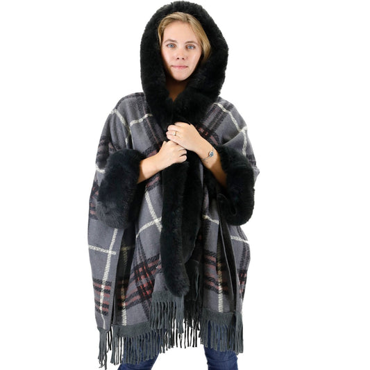 Check Pattern Fur Fringed Shawl P177 (6PC)