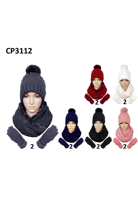 Pom Pom Knitted Beanie Scarf Glove 3 Set CP3112 (12PC)